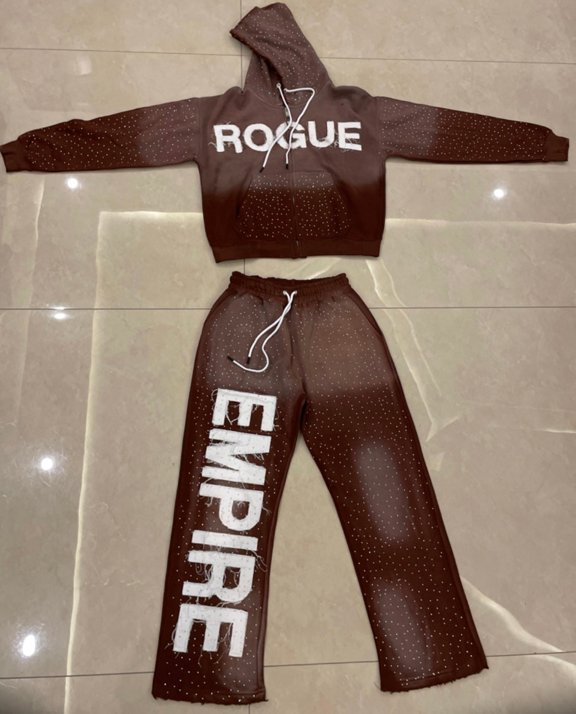 Elevate rebellion to refinement. The Brownstone Set from Rogue Empire redefines street luxury—crafted in premium heavyweight cotton and finished with an exclusive acid wash for a rich, lived-in patina that’s never replicated. Each piece bears hand-distressed lettering, a nod to raw individuality, and is accented with precision-placed rhinestones that catch the light like city sparks at midnight.